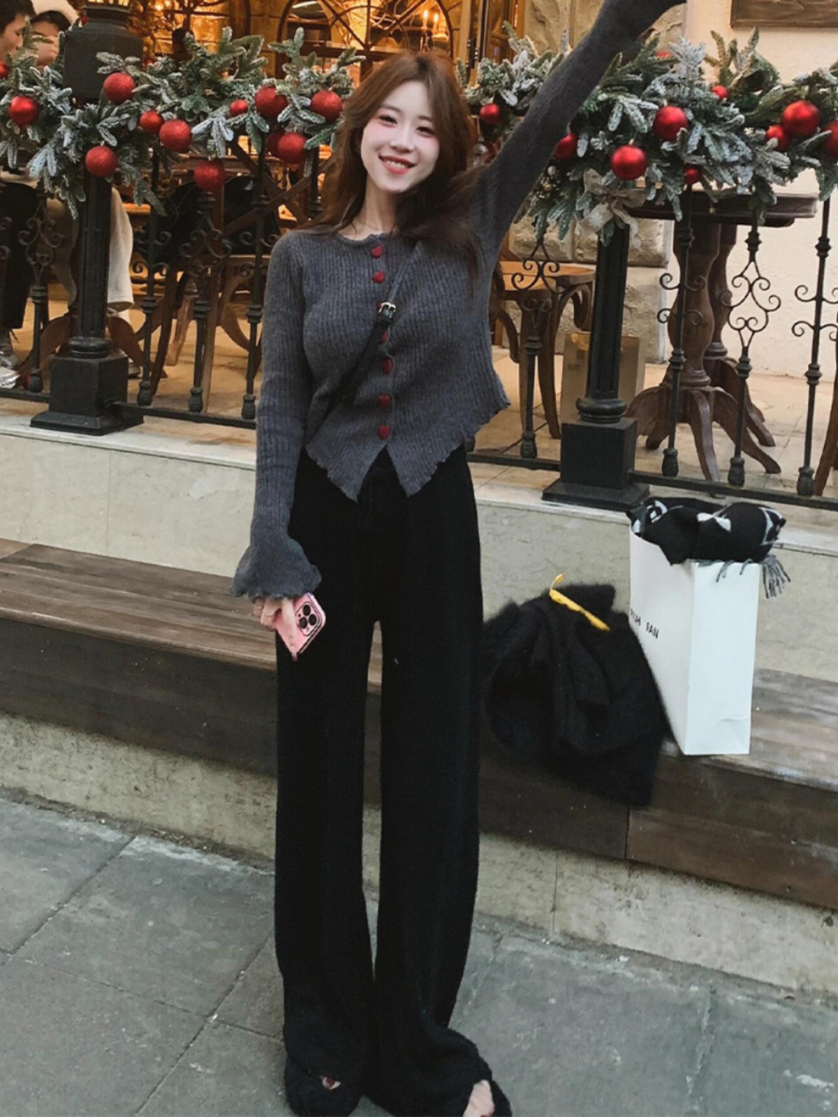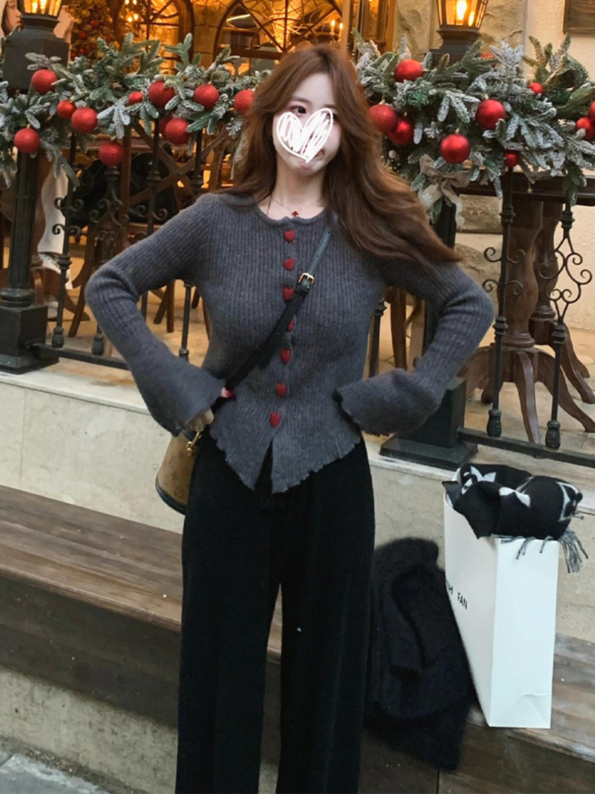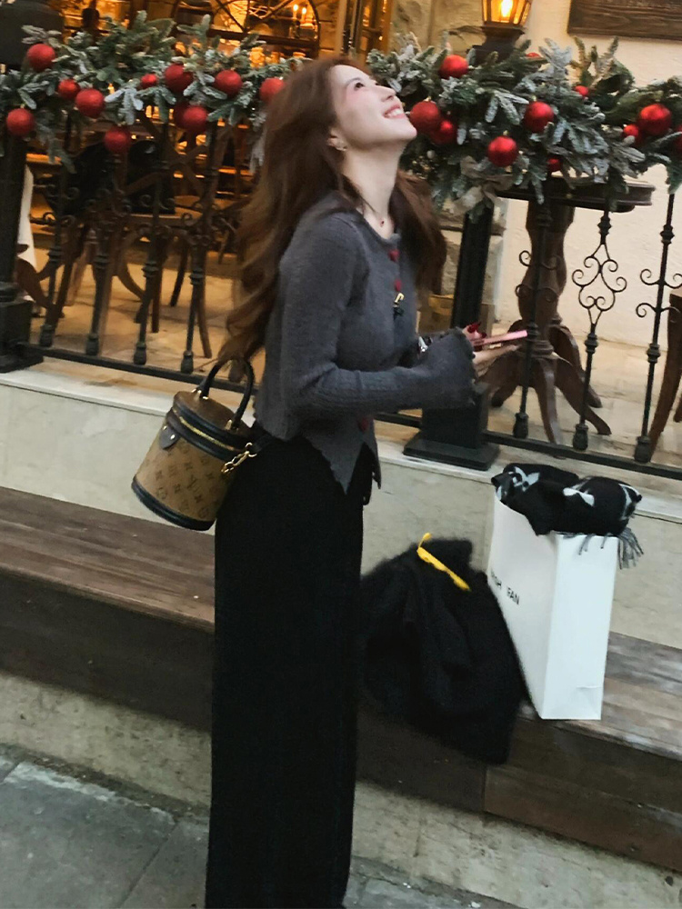 灰色温柔风修身喇叭袖加厚针织衫毛衣女秋冬2024新款韩系穿搭上衣