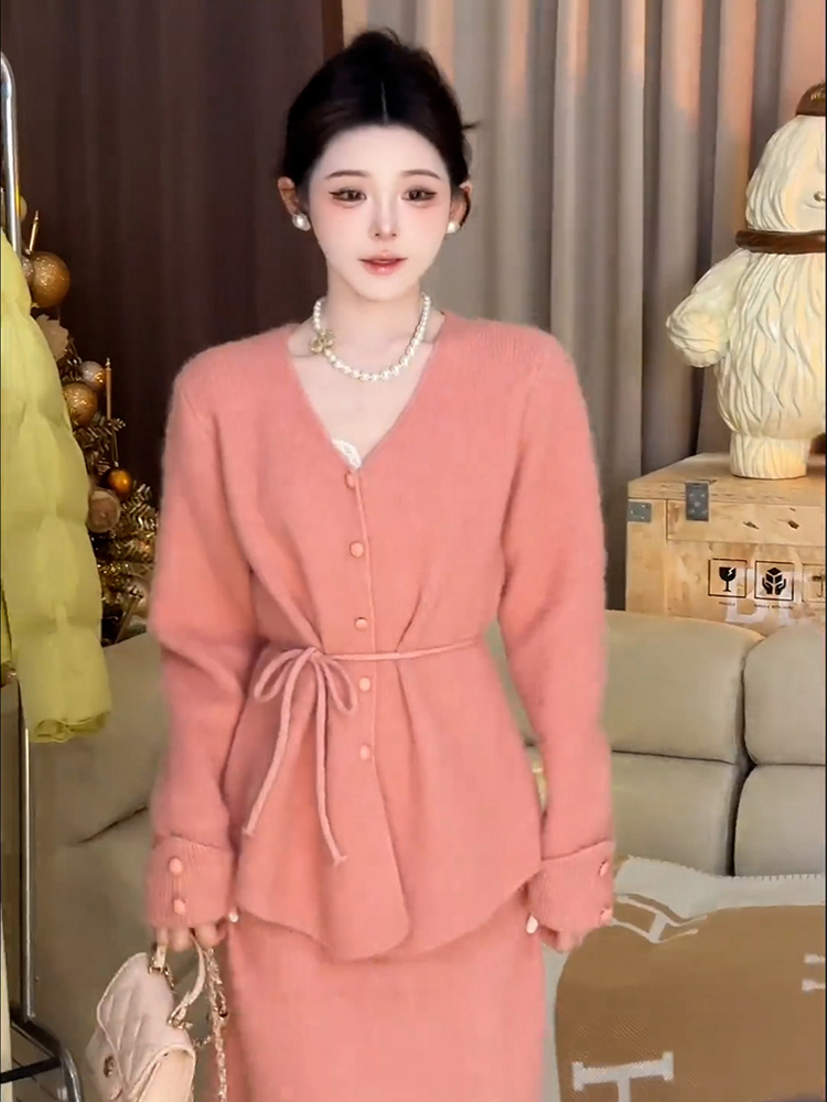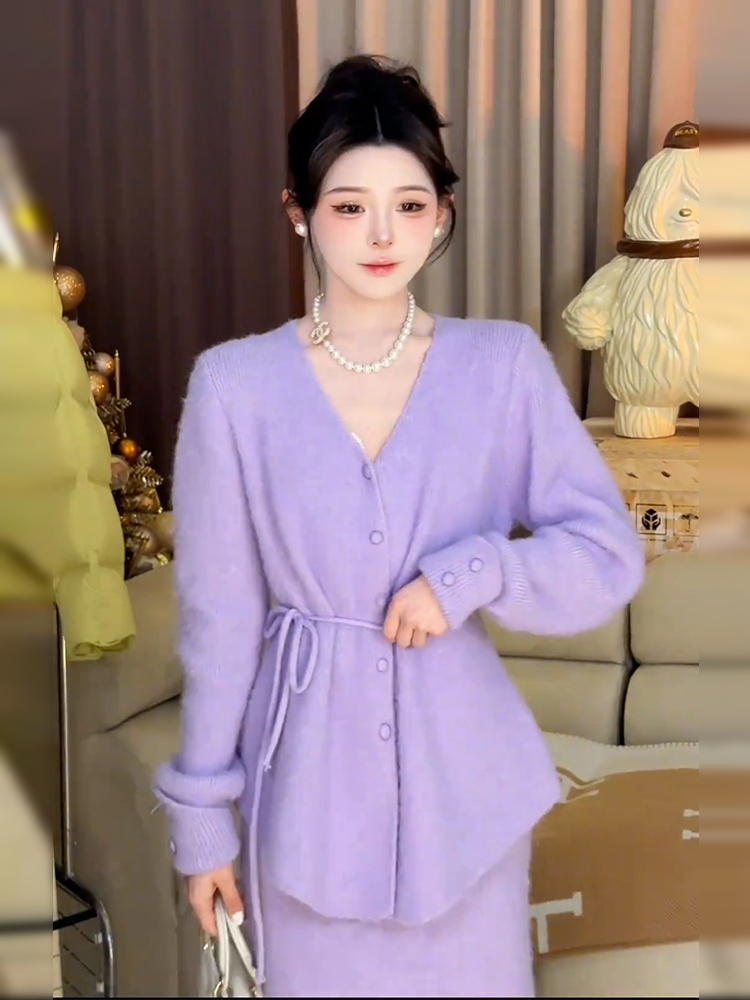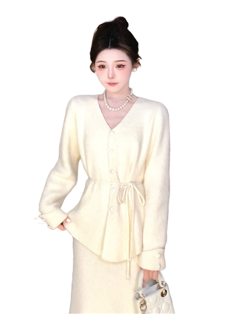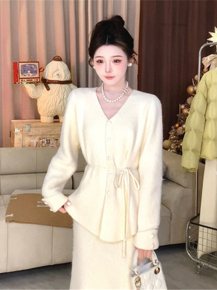 小香温柔风白色针织毛衣连衣裙子女秋冬季2024新款高级感套装长裙