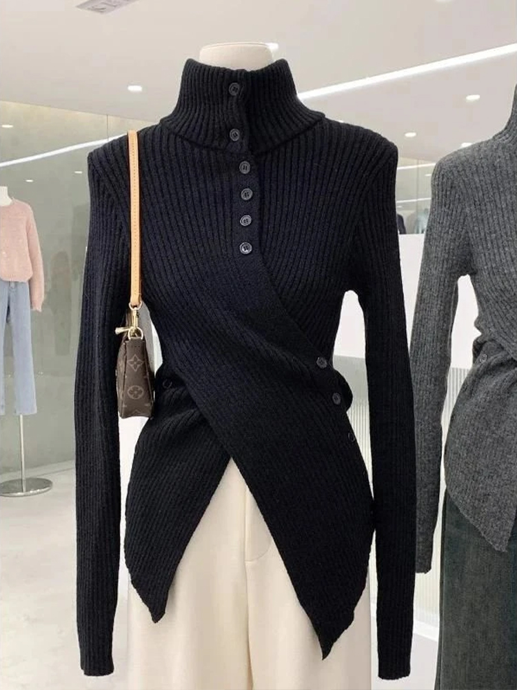欧货灰色高领羊绒针织打底衫女秋冬季不规则收腰毛衣内搭开叉上衣