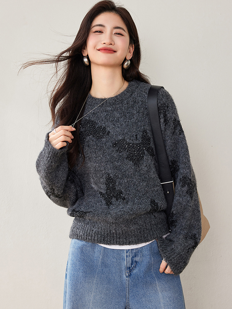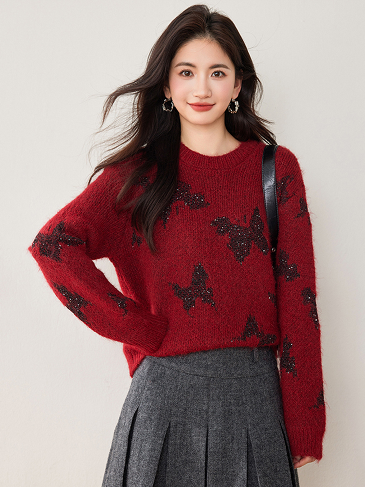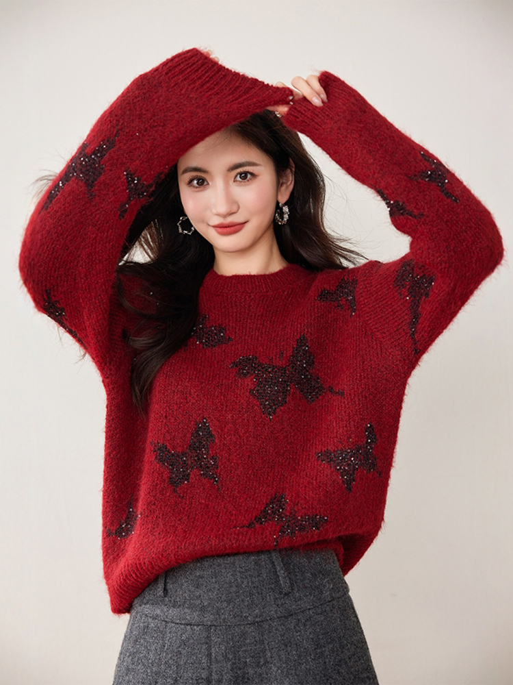 拉夏贝尔Puella韩系设计感蝴蝶红色毛衣女装小众慵懒风针织衫上衣
